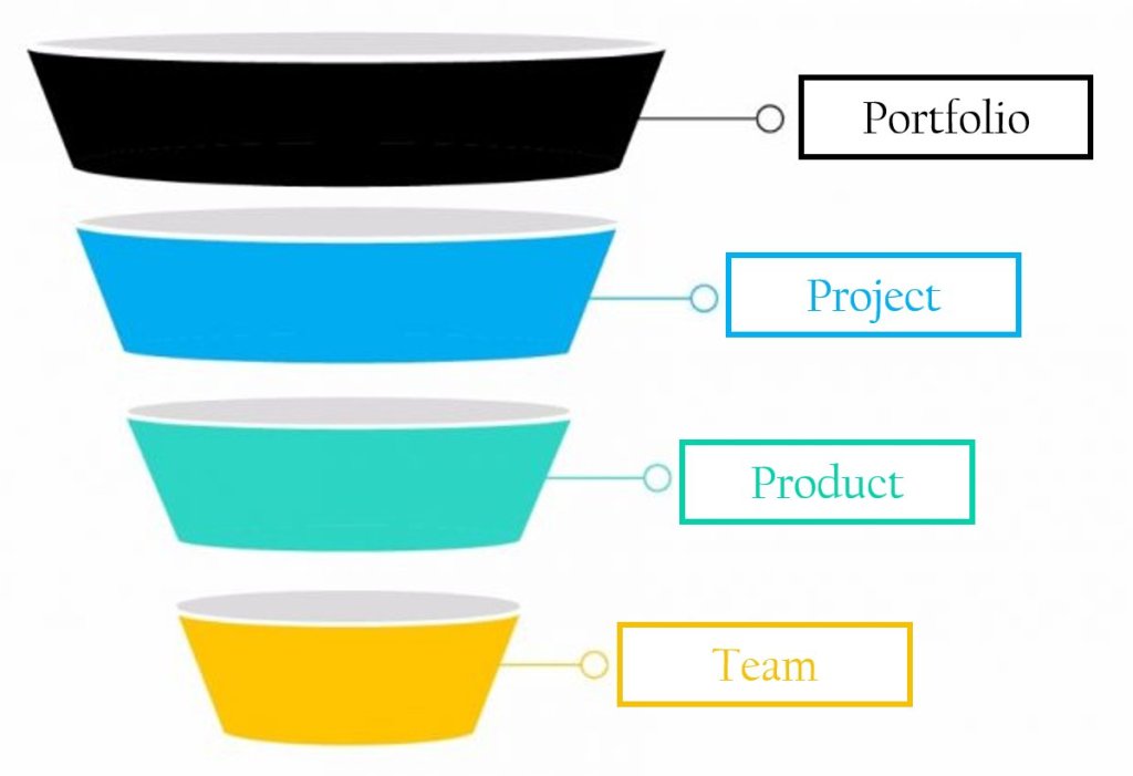 Project Level: Focusing on a set of projects. This level can sit above or below a product level depending on the size, complexity, and structure of a product. Typically, it is above a product since it can span multiple products and be captured within the portfolio. This level often oversees projects initiatives within a framework or group and across multiple products and disciplines. Focus is more on the individual initiative and seeing it through to completion.